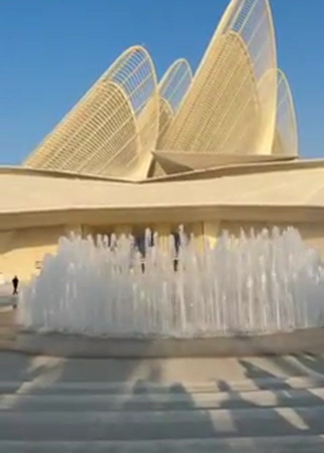large, light-colored building with a unique roof design that resembles stylized petals or wings. In front of the building, there is a circular fountain with multiple water jets spraying upwards. People are walking along a paved area in front of the building and on steps leading towards it. The sky is clear and blue. The overall impression is of a modern, possibly cultural, building complex.
