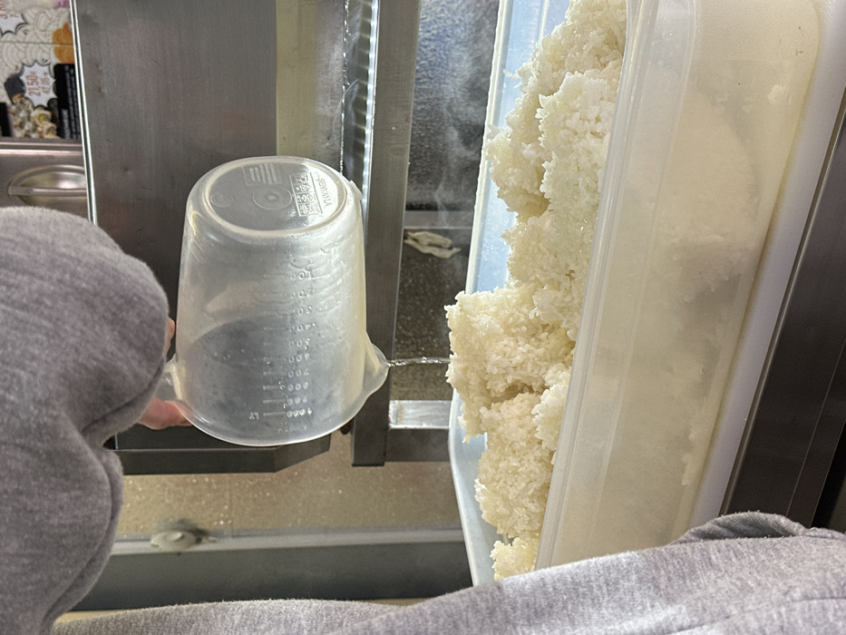 A person is depicted in a food preparation area, located within the city of Vratsa, Bulgaria. The image, captured from a slightly elevated perspective, shows the left arm of an individual, clad in a grey long-sleeved top, holding a clear plastic measuring jug with their hand. A stream of clear liquid is being poured from the jug into a large, rectangular, clear plastic container filled with mounds of cooked white rice. The measuring jug is graduated in milliliters, displaying markings up to 1000 ml. In the background, stainless steel surfaces and a partial view of a menu board with prices (e.g., 21.50, 17.90) are visible, indicating a commercial food establishment.