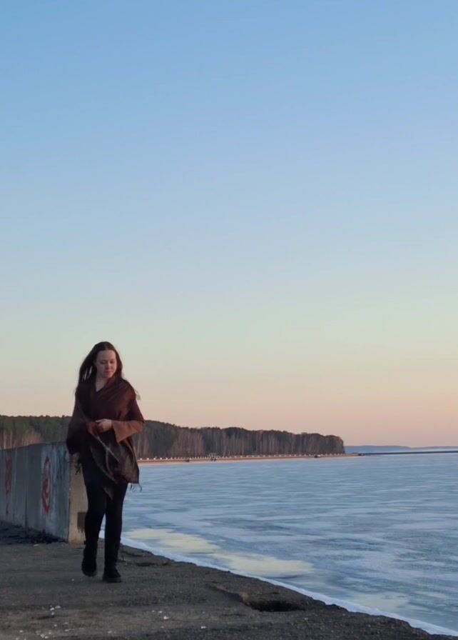 A young woman stands on a concrete ledge overlooking a body of water. The water is partially frozen, with ice covering much of its surface. The woman has long brown hair and is wearing a dark brown top with black leggings and boots. She is wrapped in a shawl or large scarf of a similar brown hue. She looks out at the water and a distant shoreline with a dense line of trees. The sky is a clear gradient of blue fading to a soft orange near the horizon. A concrete barrier runs behind her, marked with graffiti. She wraps the scarf around herself and turns to face the camera with a small smile, then turns back towards the view.