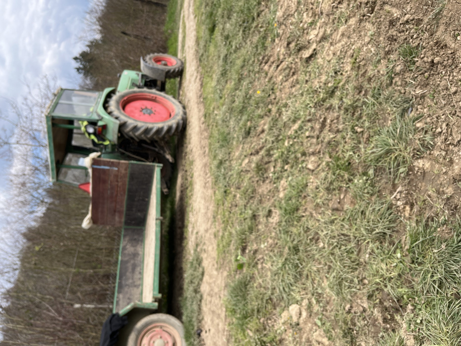 The scene is captured in Krško, Slovenia. An out-of-focus, green agricultural tractor with red wheel hubs is stationary on an unpaved dirt path. It is hitched to a green two-wheeled utility trailer featuring light-colored wooden planks and dark side panels. A black cover is draped over the front left of the trailer. The tractor has an enclosed cab, within which a yellow-green vest or similar item is visible. A red triangular warning reflector is affixed to the rear of the tractor's cab. Light-colored material is positioned on the wooden top extension of the trailer, near the tractor's rear. The foreground consists of uneven, light brown soil interspersed with patches of green grass and faint tire tracks. The background features a dense, deciduous treeline under a cloudy sky. No individuals are present, and no active operations are depicted.
