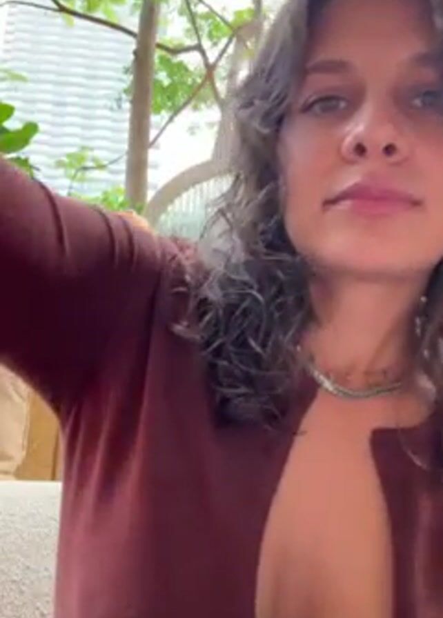 A young woman with curly brown hair and a turquoise beaded necklace is sitting in an indoor-outdoor setting with green foliage behind her. She is wearing a maroon cardigan with one button closed. She raises a stemmed glass filled with a dark beverage, possibly coffee or a cocktail, and takes a sip. Tall buildings are visible in the background.