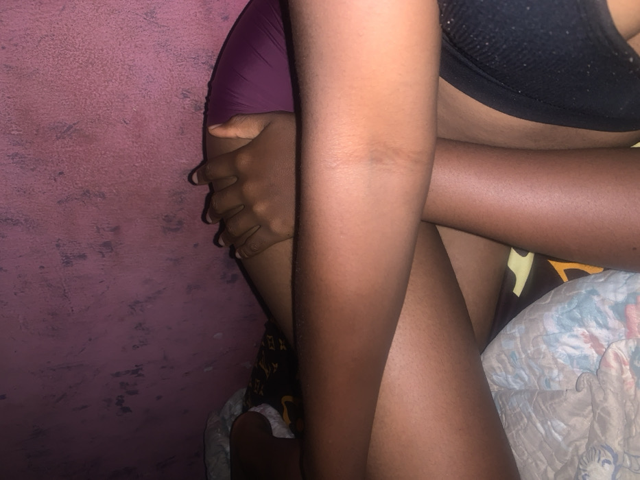 The image displays a dimly lit indoor scene, reportedly located in Takau, Nigeria. It features the intertwined limbs of at least two individuals with dark brown skin tones. In the foreground, a bare forearm and upper arm extend horizontally. Below this, multiple bare legs are positioned in close proximity, suggesting a reclining or intimate posture. A hand, with fingers gently curled, rests on a thigh in the upper right quadrant. On the lower right, black, possibly netted, undergarments are visible. Bedding includes a light-colored, quilted blanket with a faint blue and white pattern on the lower left, and a dark patterned fabric beneath other limbs. A purple pillow or cushion is partially visible in the upper right. The background consists of a distressed pink or magenta wall. The lighting is low and warm, casting visible shadows.