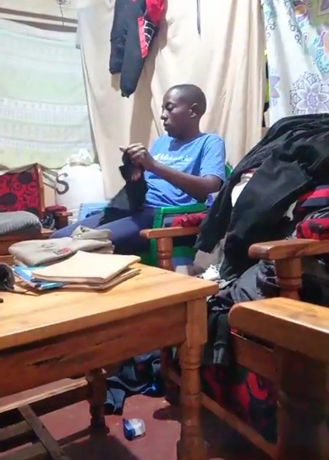 A medium shot depicts a person sitting in a green chair in a cluttered room, examining a piece of black clothing