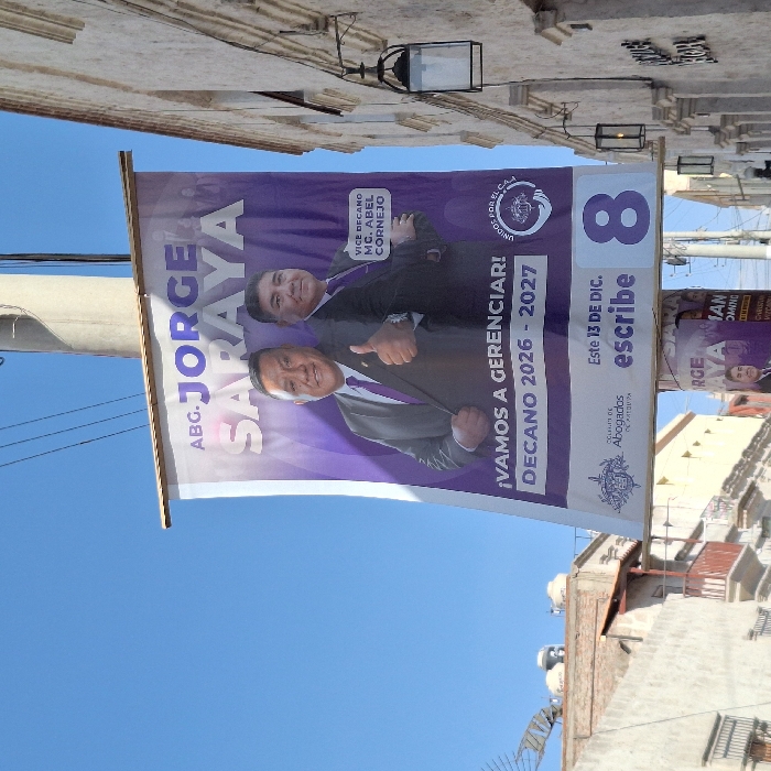 banner promoting "ABG. JORGE SARAYA" for "DECANO 2026-2027" with the running mate, "VICE DECANO MC. ABEL CORNEJO". The slogan is "¡VAMOS A GERENCIAR!". It features portraits of both candidates, the seal of "Colegio de Abogados Arequipa", and instructs to "escribe 8" on December 13th. The banner is set against a blue sky and building facades.