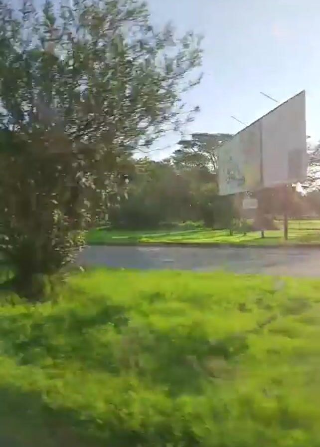 The video appears to be taken from a moving vehicle. A green lawn and various trees pass by on the right side of the frame. A road runs parallel to the lawn. The sky is visible and appears to be bright and clear. The video is a bit shaky due to the movement of the vehicle. The lighting suggests it is daytime.