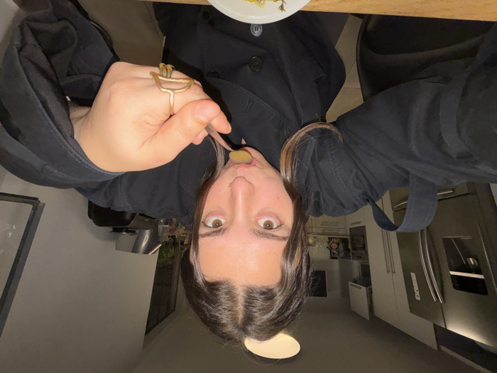 An indoor scene in a residence in Ramat HaSharon, Israel, depicts an individual from the chest up, engaged in eating. The subject, a person with dark hair and a nose piercing, wears a dark, buttoned garment and looks directly at the camera. Their right hand, adorned with a distinctive gold-toned ring on the ring finger, holds a metal spoon to their mouth, containing a small amount of light-colored food. A white bowl with visible green and yellow food rests on a wooden table surface in the lower foreground. The background reveals a modern kitchen area featuring a stainless steel double-door refrigerator with an integrated dispenser, white cabinetry, and possibly an oven. A dark chair is partially visible on the left. The lighting is artificial, emanating from an overhead fixture and kitchen lights, suggesting an evening or nighttime setting.