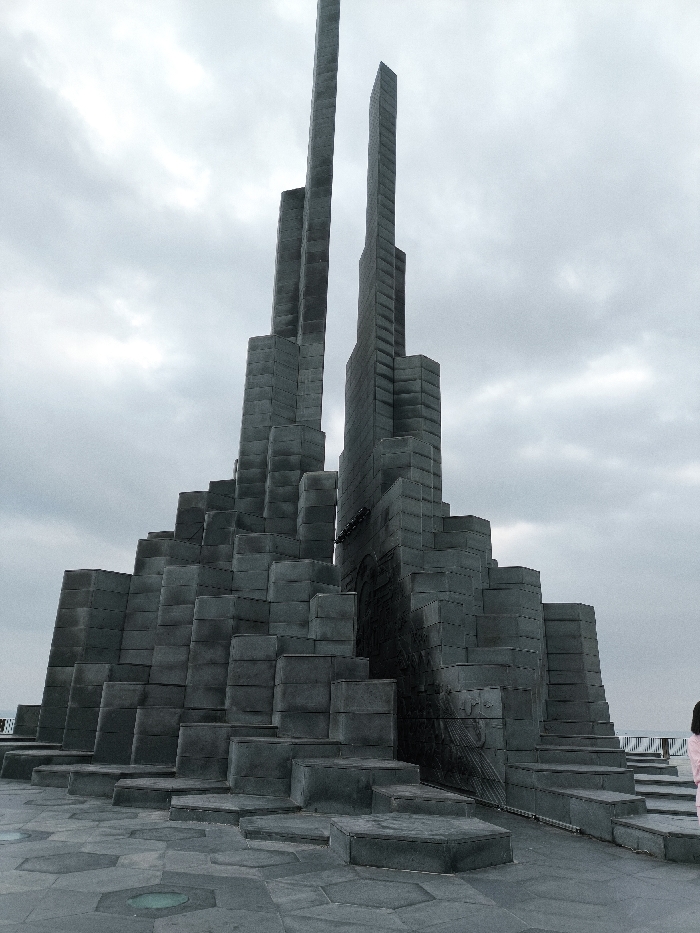 An imposing, multi-component monument, identified as Nghinh Phong Tower, stands under an overcast, cloudy sky in Thành phố Tuy Hòa, Vietnam. The primary structure is composed of numerous dark grey, rectangular blocks stacked in a geometric, stepped configuration. It features a central base from which two prominent, tall, slender, rectangular spires ascend vertically, flanked by several shorter, stepped towers of varying heights. On the right side of the main monument, a darker rectangular panel displays a discernible etched relief design. The monument is situated on a paved plaza comprised of dark grey hexagonal and rectangular flagstones, some of which incorporate embedded circular lights. In the distant background on the right, a white railing is partially visible. A single individual is partially observed on the far right edge of the frame, from the right side of their torso, wearing a light pink long-sleeved garment, standing near the base of the monument.