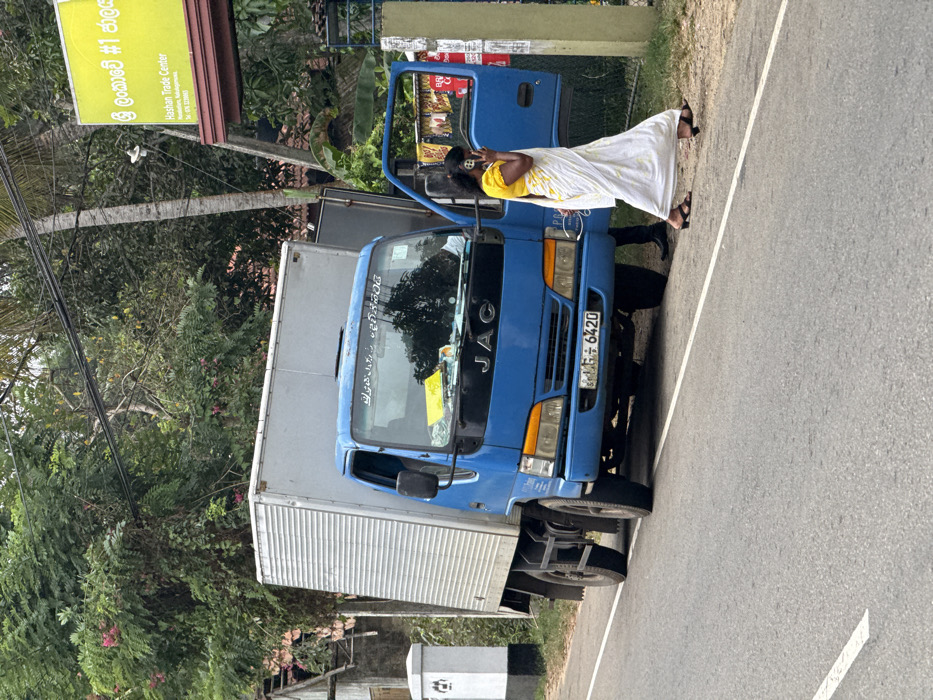 A blue JAC truck with an open door parks on the side of a road. A woman in a yellow and white dress stands near the open door, talking on a cell phone. The truck has a white container on the back. Lush green trees and foliage surround the truck. A sign reading "Hashan Trade Center" is visible in the background.