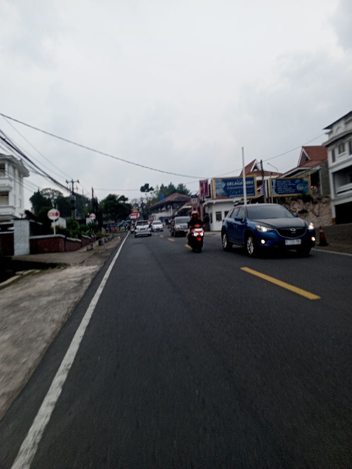 A wide-angle, low-perspective photograph captures a busy multi-lane asphalt road under an overcast sky in the city of Kheda, India. The road features a solid white line defining the left shoulder and a dashed yellow line marking the center of the visible lanes. In the foreground and mid-ground, vehicular traffic moves towards the viewer. A blue SUV, possibly a Mazda CX-5, with its headlights illuminated, occupies the lane closest to the camera. Immediately behind it, a red motorcycle with its headlight on is ridden by an individual wearing a helmet. Further down the road, several other vehicles, including a white sedan and a dark-colored SUV, are visible in the opposing lanes of traffic. To the left of the road, a concrete sidewalk abuts a low wall constructed from red bricks and grey concrete. Beyond this wall, a multi-story white building with distinct architectural features is present, accompanied by green foliage and utility poles with numerous overhead power lines. A circular red traffic sign with a horizontal white bar is partially visible near the roadside. On the right side of the road, a raised dirt embankment gives way to various buildings. A prominent large billboard displays blue-themed advertisements, with the text "DELAGA BIRU" clearly legible, along with other text. Adjacent to and behind the billboard, structures with reddish-brown tiled roofs and white walls are visible, extending into the background. The sky is uniformly gray and overcast.