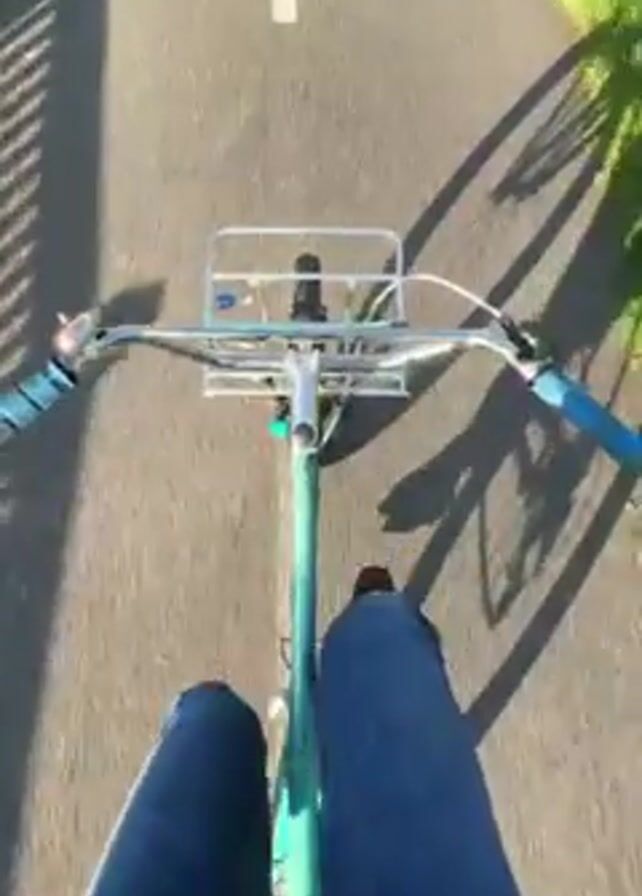 person riding a light-blue bicycle on a paved path marked with a white line. The cyclist is wearing blue jeans and brown shoes, and their legs are visible as they pedal. The bike has a silver basket attached to the handlebars. The camera perspective is first-person, positioned above the front wheel of the bicycle. The path is bordered by grass and a shaded area. The video is taken during the daytime in bright sunlight.