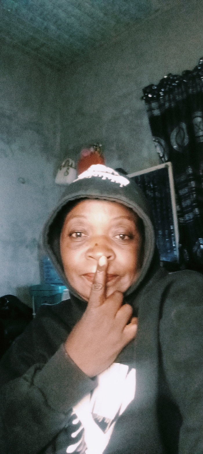 A person wearing a black hoodie is positioned in a dimly lit room. The hoodie is up, covering their head. They are holding a finger to their nose, making a "shhh" gesture. In the background, there's a wall, a decorative object, curtains, and a translucent container. The overall image has a grainy quality due to the lighting and possibly the camera used.