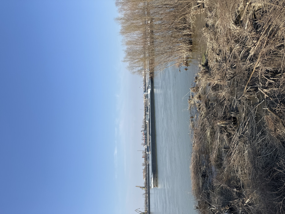 The image captures a daytime scene along the Danube River in Ruse, Bulgaria, under a clear blue sky. The foreground presents a low, muddy riverbank extensively covered with an accumulation of dried, tangled branches and dead vegetation. To the right, a cluster of thin, bare-branched trees partially extends into the river water, with two dark-colored ducks visible on the surface near their bases. In the midground, a long, dark-hulled cargo vessel with white superstructure components traverses or floats on the river. The background displays the distant opposite bank, characterized by industrial infrastructure, including two large orange gantry cranes visible on the left, various industrial buildings, silos, and scattered bare trees. No human figures are present.