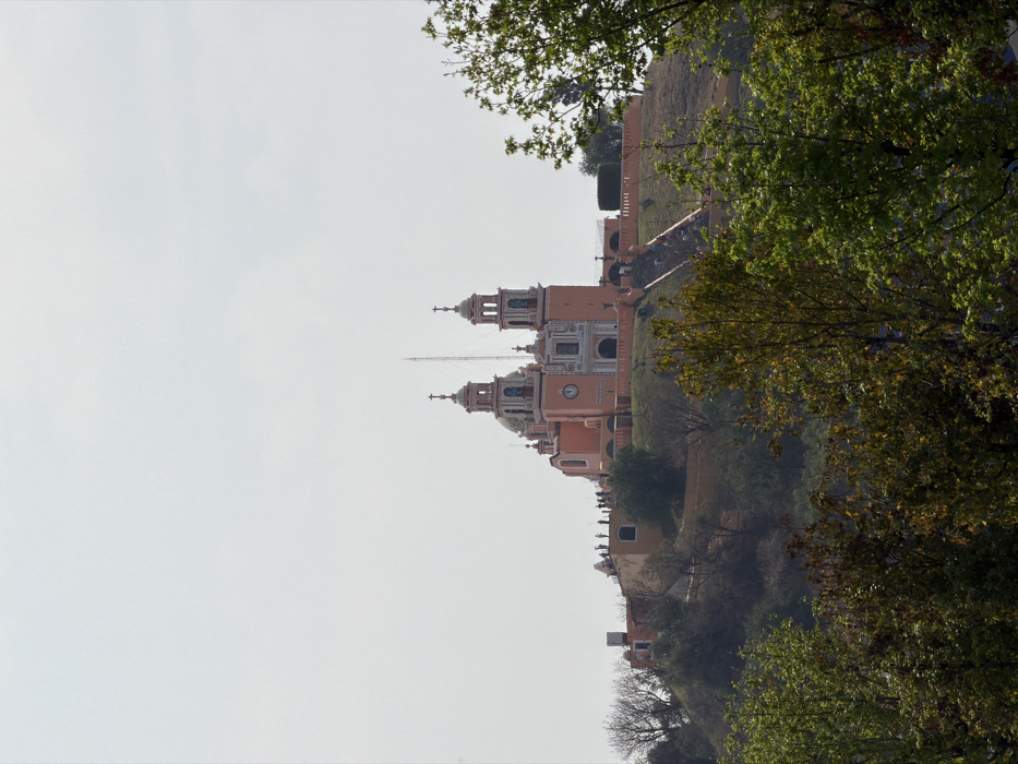 The image displays the Santuario de Nuestra Señora de los Remedios, located atop the Great Pyramid of Cholula in Cholula, Puebla, Mexico. The church, predominantly peach-colored with white baroque architectural details, features a central dome, two symmetrical bell towers capped with crosses, and a circular clock face on its main facade. A slender, white antenna or mast rises directly behind the church's right tower. The church is situated on a large, vegetated hill, with a wide stone staircase ascending its face, leading to the church entrance. Small, unidentifiable human figures are visible on the church's upper platform and on the ascending stairs. The foreground consists of dense deciduous trees and shrubs, displaying a mix of green and darker, sparser foliage, partially obscuring the lower slopes of the hill. The sky is bright and featureless, indicative of an overcast or hazy condition.