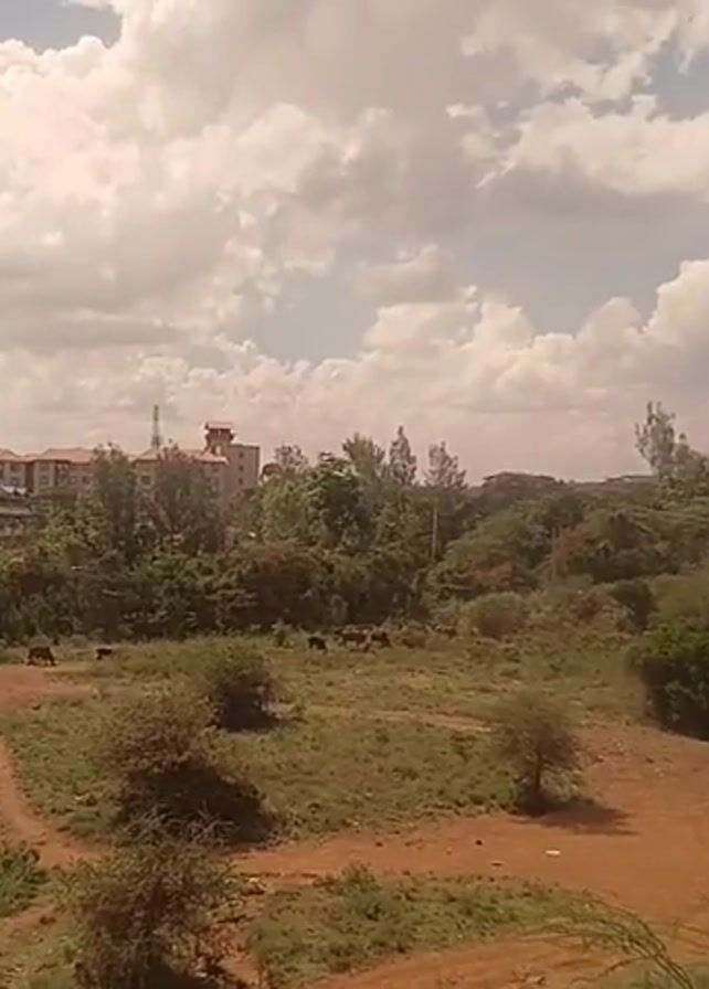 The camera pans over a partly sunny vista, showing a grassy field in the foreground with dirt paths crisscrossing it. Several dark-colored cows graze across the field. A couple of people are visible on the right side of the shot. Beyond the field, there's a line of trees, and beyond that, several buildings, including a light-colored complex of apartments or offices, and a tall building in the distance on the right. The sky is partly cloudy.