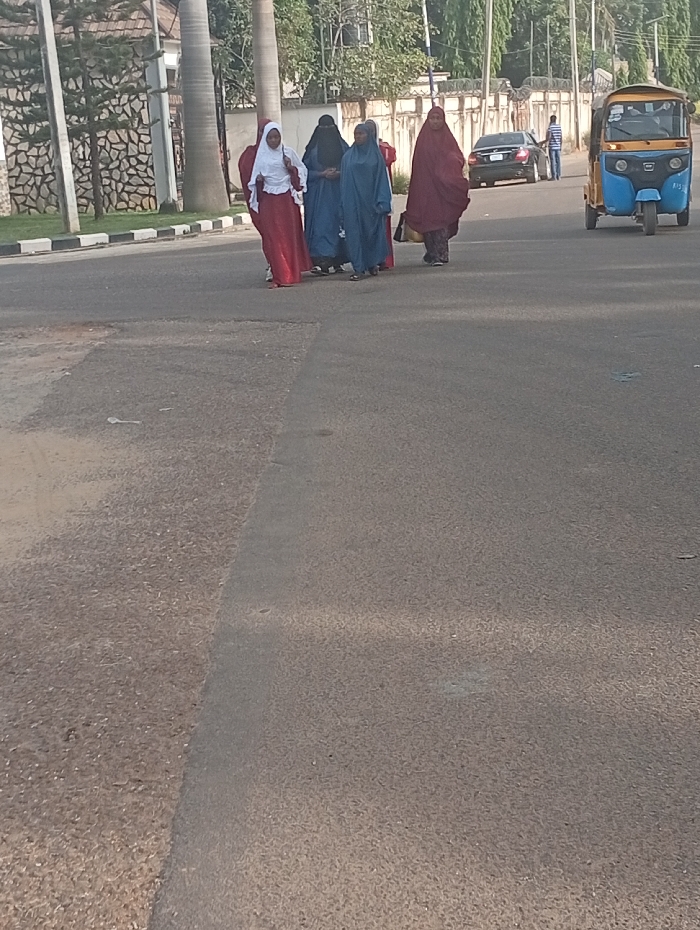 The image captures a daytime street scene in Unguwar Sarki, Nigeria. An asphalt road dominates the foreground and midground. Five females are positioned on the left side of the road, near a curbed sidewalk marked with black and white stripes. The leftmost female wears a white hijab and a long red garment. To her immediate right, a female is dressed in a black niqab and a dark blue garment. Adjacent to her, another female wears a light blue garment with a matching head covering, with her face visible. A fourth female, partially obscured, wears a red garment. The rightmost female in this group wears a deep red garment with a matching head covering. In the background, on the right side of the road, a blue and yellow motorized tricycle is present. Further down the street, a dark-colored sedan is visible, and a male individual wearing a striped shirt and dark trousers is walking on the roadside. The left periphery of the scene features a stone wall or fence, behind which trees and foliage are present.