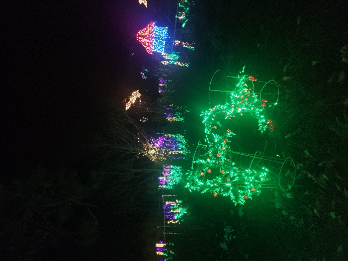 An outdoor display of colorful Christmas lights illuminates the dark. A string of light fixtures displays a variety of colors, including red, white, blue, purple, and green. Shapes range from a house-like form to abstract designs. Trees are wrapped with green lights and adorned with red ornaments, framed by wire arches. The scene is vibrant and festive.