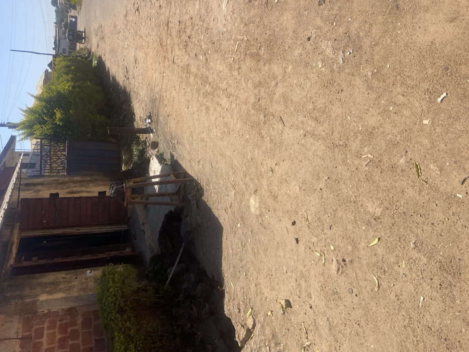 The scene depicts an outdoor street view in the city of Jos, Nigeria, under clear daylight conditions with strong sunlight casting shadows. The foreground consists of a light brown, packed dirt road with scattered small stones, dry leaves, and minor debris. To the immediate left, a single-story building is visible. Its left portion features exposed red brickwork, while the central section is covered in a lighter, possibly painted or rendered, material. An open doorway, approximately 2 meters high, reveals a dark interior. A partially open wooden slatted door panel is visible on the right side of the doorway. In front of the doorway, a concrete step leads down to a small concrete platform. A slender, light-brown wooden stool, approximately 0.7 meters high, stands on this platform, directly centered in front of the open doorway. A dark, possibly metallic, object rests on top of the stool. Immediately to the left of the doorway, a dense, dark green trimmed bush or hedge grows, partially obscuring the lower brickwork. A shallow, irregular trench or ditch runs along the front of the building between the concrete platform and the dirt road. Extending from the right side of the building, a row of uniformly trimmed, dense green hedges lines the edge of the dirt road. Beyond these hedges, a dark metal gate and portions of another building are visible. The dirt road extends into the midground, where it transitions into a paved asphalt road in the distance. A light-colored, three-wheeled vehicle (tricycle) is observable on the paved road in the far background, moving away from the viewer. Utility poles with overhead wires are visible against the clear, light blue sky on the right side of the frame. No individuals are present in the visible area.