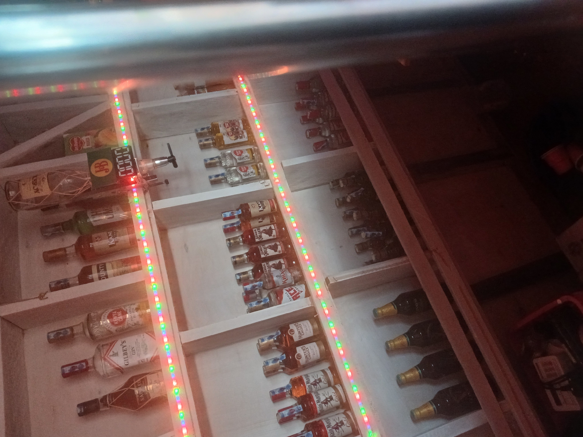 The image depicts a multi-tiered wooden shelving unit, likely painted light white or cream, prominently displaying numerous bottles of alcoholic beverages. The unit is illuminated by multicolored LED strip lights affixed along the front edge of each shelf. On the top shelf, from left to right, are bottles labeled "NAPOLEON," "GILBEY'S GIN," two "KENYA CANE PINEAPPLE FLAVOR," "DUNYA," and "KANI ESTRA." A green bottle is partially visible on the far right. The second shelf from the top features a spirit dispenser mounted upside down to an empty bottle, with a digital counter displaying "0000" below it. A "J.B." label and a "Del Monte Mango" juice box are also visible in this area. To the left of the dispenser, more bottles include "CAPTAIN MORGAN Gold," "HUNTER'S CHOICE," "TRIPLE ACE," "KIBAO," and "GENERAL SNEAKING." The bottom shelf contains several dark-colored bottles, consistent with beer or stout, with at least one "GUINNESS" label partially visible. Smaller, unidentified bottles are arranged behind these. A red plastic container is partially visible in the bottom-left corner. On the far right, a vertical, out-of-focus metallic cylindrical object, possibly a pole or pillar, reflects the LED lights. The background beyond the shelving unit is dark. No individuals are present, and no active interactions or actions are depicted. The scene is located in Unknown, Unknown.