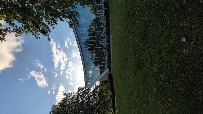 large, curved, glass-walled building situated in a grassy field. The building is located in the city of Wuppertal, Germany at the coordinates 51.252 latitude, 7.141 longitude. Trees are visible to the left and upper right of the building. The sky is bright blue with white clouds. The image was likely captured during the day, as the sun is visible shining through the glass facade of the building. No people are visible in the image. The field appears to be a public lawn or park, as there is no sign of any fencing or other barriers. The building's exterior is composed of large windows, and the building appears to be multi-story, although this cannot be determined for sure from the angle of the image. The building appears to be a modern architectural design. The grass in the field is short and green, suggesting it is well-maintained. There is a thin line of trees between the building and the field, suggesting a possible sidewalk or path.