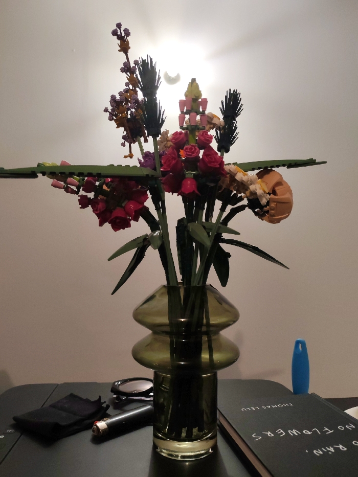 A Lego botanical bouquet stands in a green glass vase on a dark surface. Red roses and other colorful, Lego-built blooms are arranged with green leaf elements. Beside the vase are a black pouch, sunglasses, a pen, and a book titled "NO FLOWERS." In the background, a plain wall is illuminated by a bright light. A blue object is partially visible on the right side of the frame.