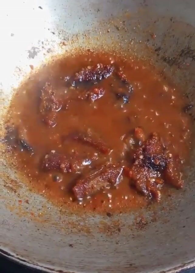 close-up of a metal pan containing a simmering reddish-brown liquid. Scattered throughout the liquid are dark, slightly charred pieces of food. The pan's surface shows signs of wear and previous use, with stains and residue. Steam rises gently from the hot mixture. The video is shot from above, providing a direct view into the pan. The background is dark and out of focus.