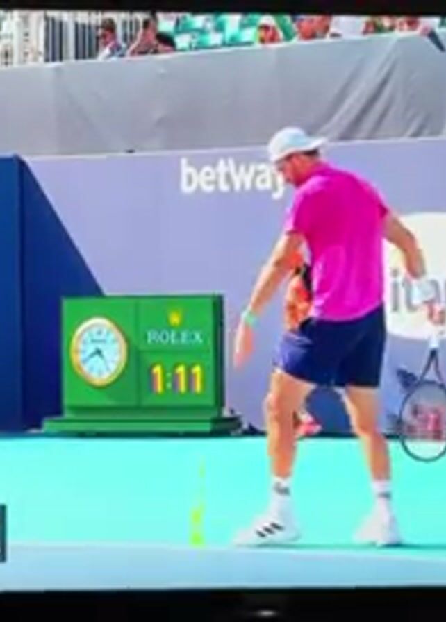 A male tennis player, wearing a pink shirt, white hat, and dark blue shorts, prepares to serve the ball on a blue tennis court. The scoreboard shows "COLLIGNON 7 3 0" and "DIMITROV 6 2 15." A Rolex clock shows 1:11. There are multiple advertising logos, including Lacoste and Betway. The game is being broadcasted on MAX SPORT 1 HD. A line of spectators are visible in the background.