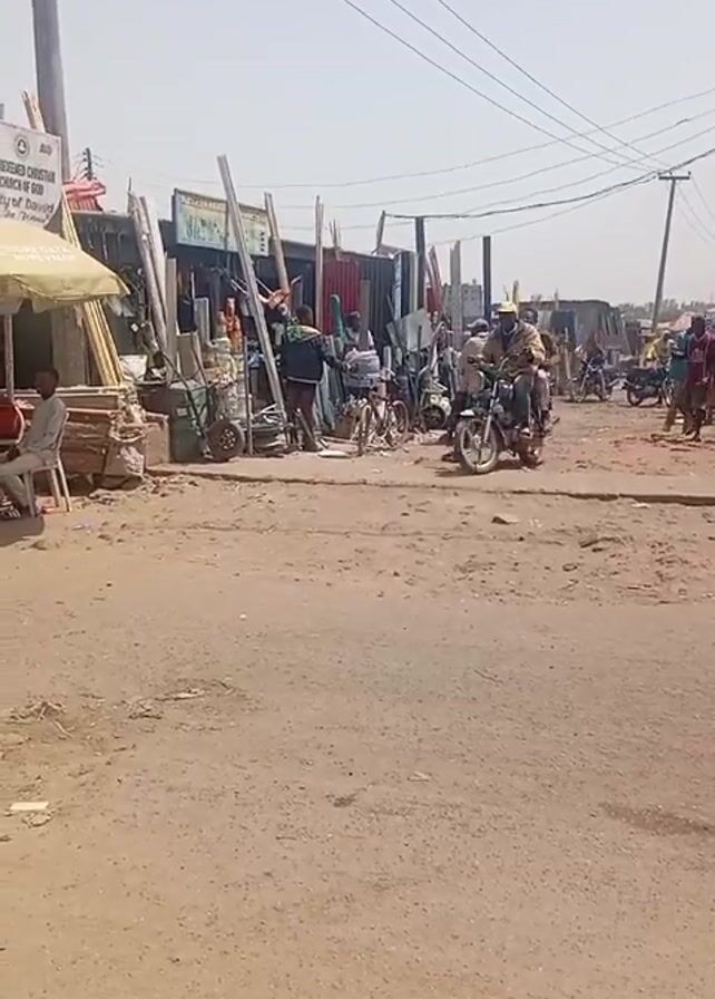 dusty street scene in what appears to be a market or trading area. Several people are present, some walking and others riding motorcycles. The road is unpaved, with several shops or stalls lining the sides. These structures appear to be makeshift, constructed from corrugated metal sheets and wood. There are various items for sale displayed in front of these stalls. A sign for a church is visible in the background. The weather looks sunny and bright. Several overhead power lines are also visible.