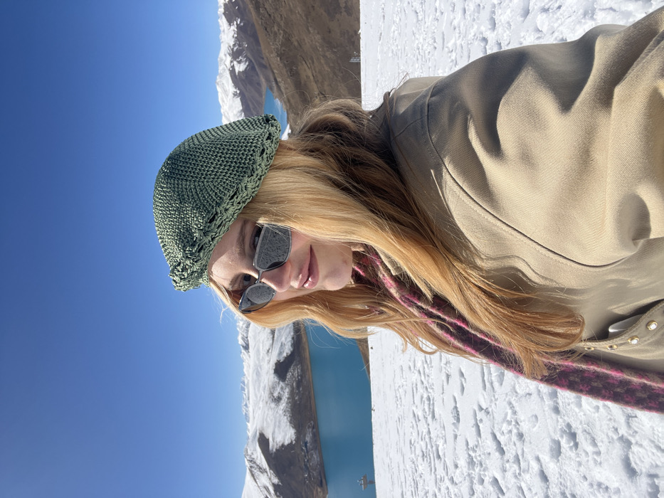 A single female individual is depicted in a mid-shot against a snowy mountain backdrop, situated in the city of Baidi, China. She has long, light brown hair and a slight smile, wearing dark, rectangular sunglasses and a green knitted beret. Her attire includes a light beige jacket or coat with visible gold-toned buttons on the front, and a pink and dark red patterned scarf around her neck. The immediate foreground is covered in snow, extending to a bright turquoise-blue lake in the mid-ground. Distant snow-capped mountains line the horizon under a clear, intense blue sky. The environment is brightly lit by natural daylight.