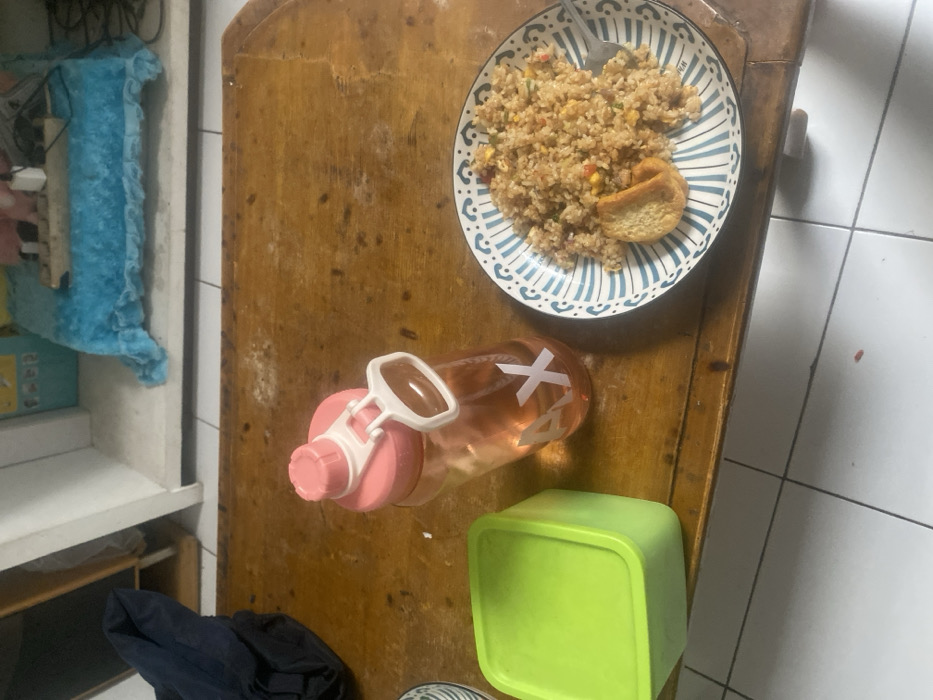 A plate of fried rice and a piece of fried tofu sit on a wooden table near a water bottle with a pink lid. A green container is next to the bottle. Part of a blue garment is visible on the left side, and blue clothing is at the bottom left corner. White tiles are visible on the right side, indicating a wall or floor.