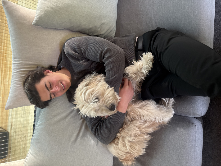 A young man lies on a gray sofa, nestled among several cushions. He wears a gray sweater and black pants with a belt. His eyes are closed and he appears to be smiling softly. He is holding a fluffy, light-colored dog with both arms, embracing it closely. The dog's fur is medium-length and covers most of its face. The scene suggests a moment of relaxation and affection.