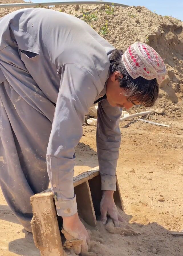 - "A man in a light-colored shalwar kameez and a white and red embroidered cap is using a wooden brick mold on the ground" by FM-B5wmg2, licensed under CC BY 4.0