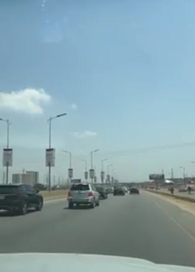 The video depicts a car's-eye view of a road with multiple lanes of traffic on a sunny day. The sky is a clear blue with some scattered clouds. Several cars are visible in the lane ahead, including a silver SUV and a dark SUV. Street lights with attached banners line the side of the road. Power lines run overhead. A person can be seen standing on the side of the road near one of the light poles. The dashboard of the car recording the video is visible at the bottom of the frame.