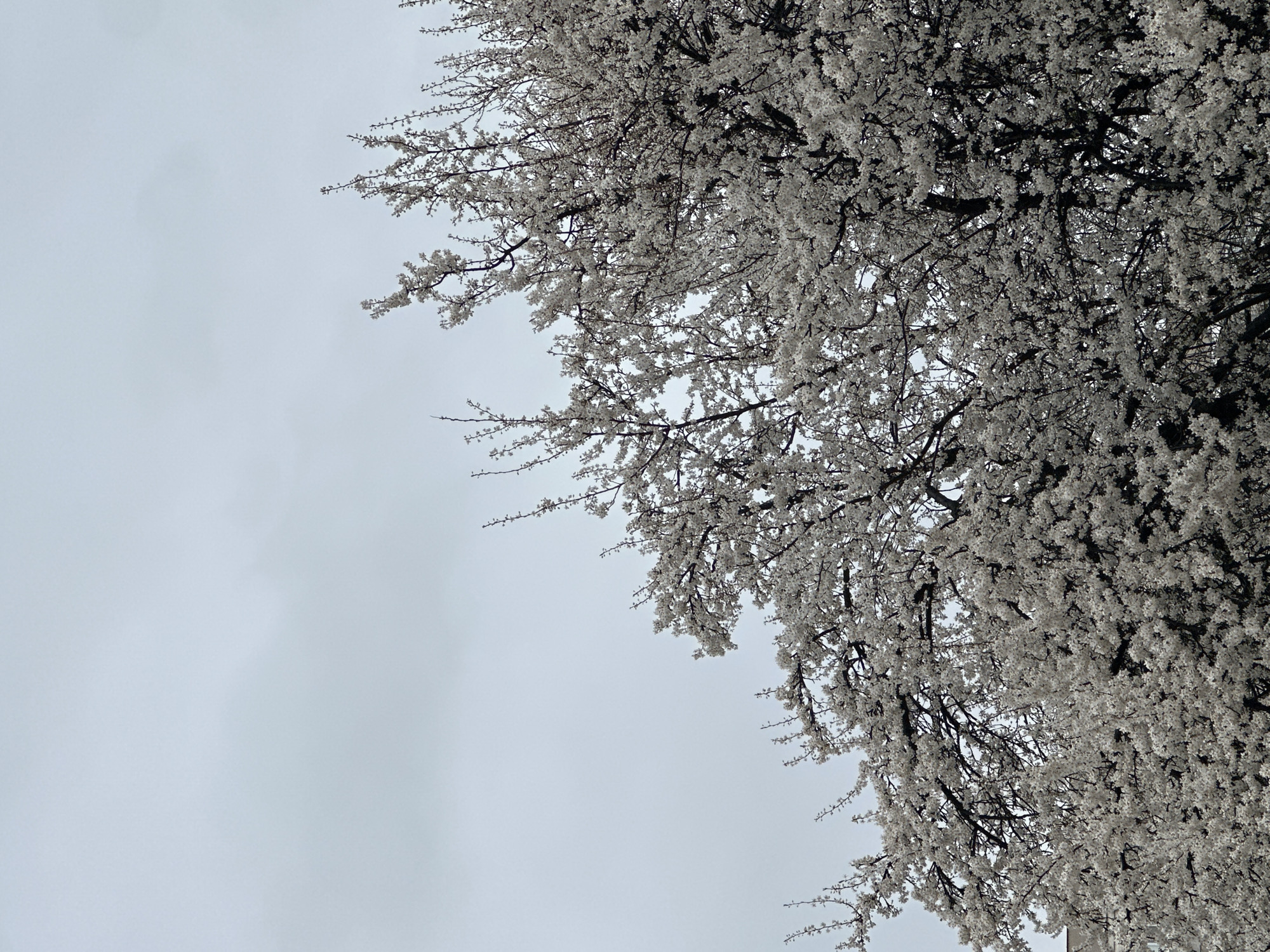 The image displays the upper canopy of a deciduous tree in full bloom, observed from a low angle against an overcast sky. The tree is densely covered with numerous small, white flowers. Its dark branches and twigs are visible interspersed among the blossoms. The sky in the background is a uniform light grey, indicating an overcast condition. A light-colored building facade is partially visible in the extreme lower-left corner, positioned behind the tree. No individuals or specific actions are discernible. The scene is located in the city of Sofia, Bulgaria.