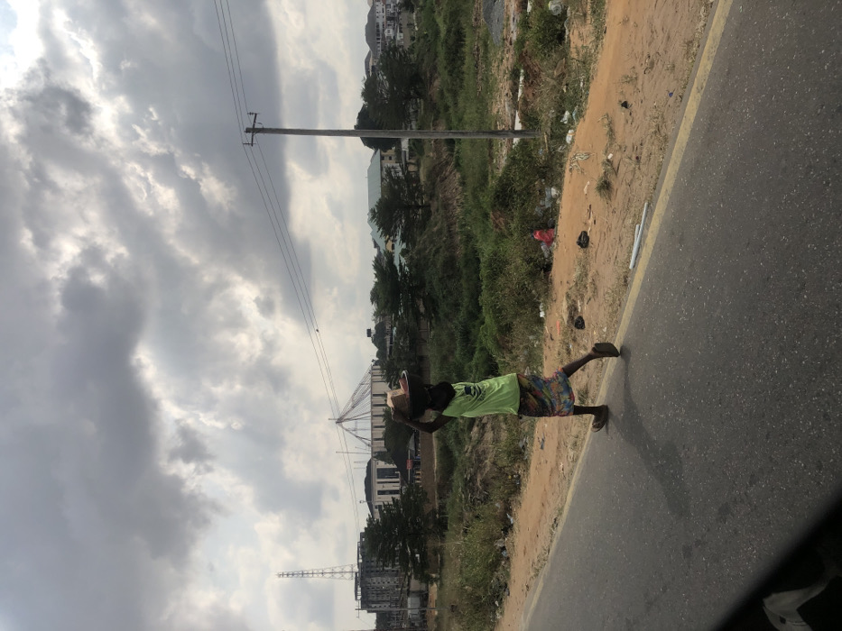 - "An adult female is depicted walking from left to right along the unpaved shoulder of a two-lane asphalt road under a heavily overcast sky in Owerri, Nigeria" by FM-Hf7RJ2, licensed under CC BY 4.0
