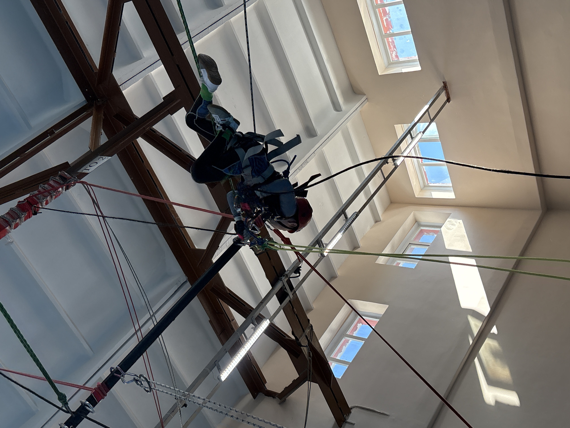 person suspended in the air by ropes and a harness inside a large indoor space with a high ceiling