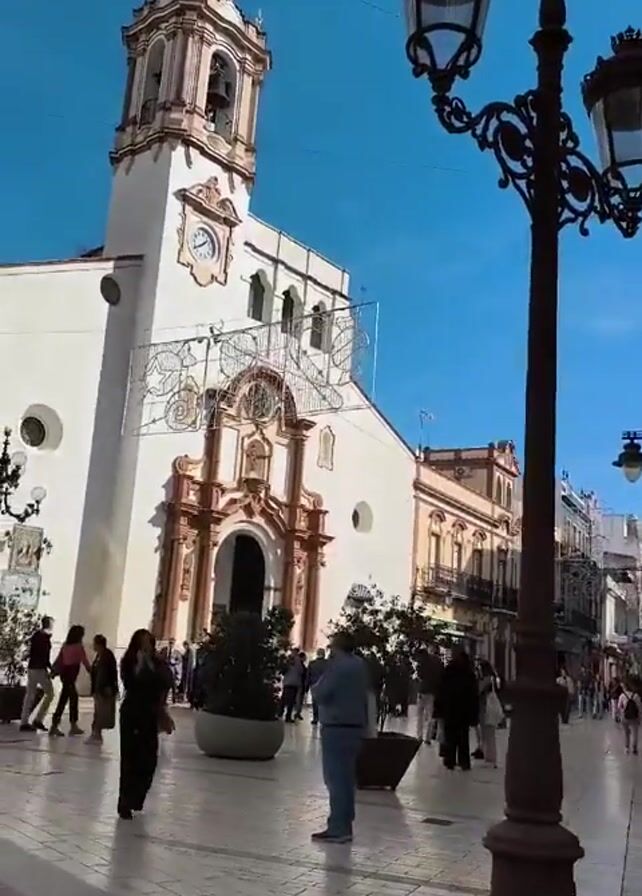 street scene in front of a church. The church is white with a bell tower and an ornately decorated entrance. A clock is visible on the church facade. There are people walking on the paved street in front of the church. Some are walking towards the church and others are walking away from it, further down the street. The street is lined with buildings and streetlights. The sky is blue. Some greenery in planters is present.