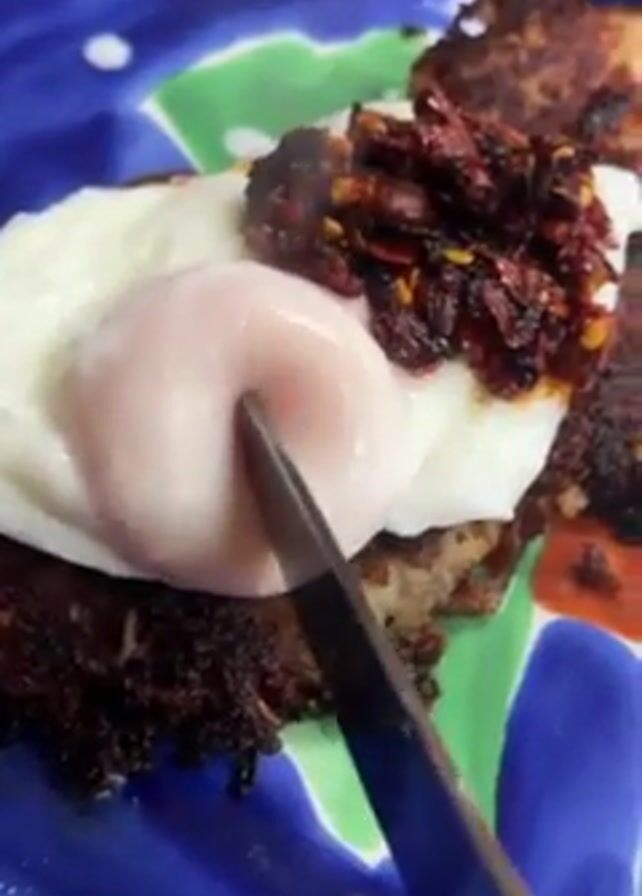 plate of food, consisting of potato cakes, a poached egg, and a spicy relish. A knife is used to cut into the poached egg, releasing the yolk. The plate is blue with a stylized design, and the food is presented in a visually appealing manner.