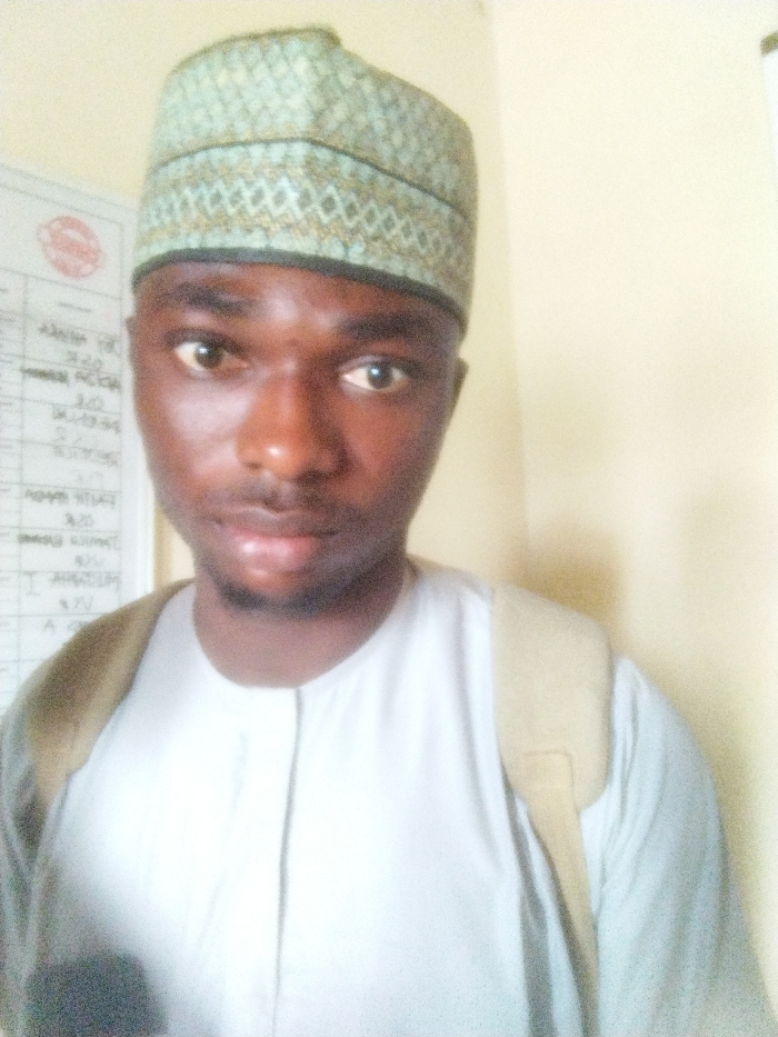 A medium close-up portrait shows an adult male subject looking directly into the camera. He has a dark complexion, brown eyes, and a short, trimmed beard. He is wearing a light green cap with dark green geometric patterns and a light grey traditional tunic. A light beige backpack is visible over his shoulders. The background features a plain, light yellow wall. To the subject's left, a whiteboard or poster with partially visible, illegible handwritten text and a red circular logo is present. The scene is an indoor environment in Fagge C, Nigeria.