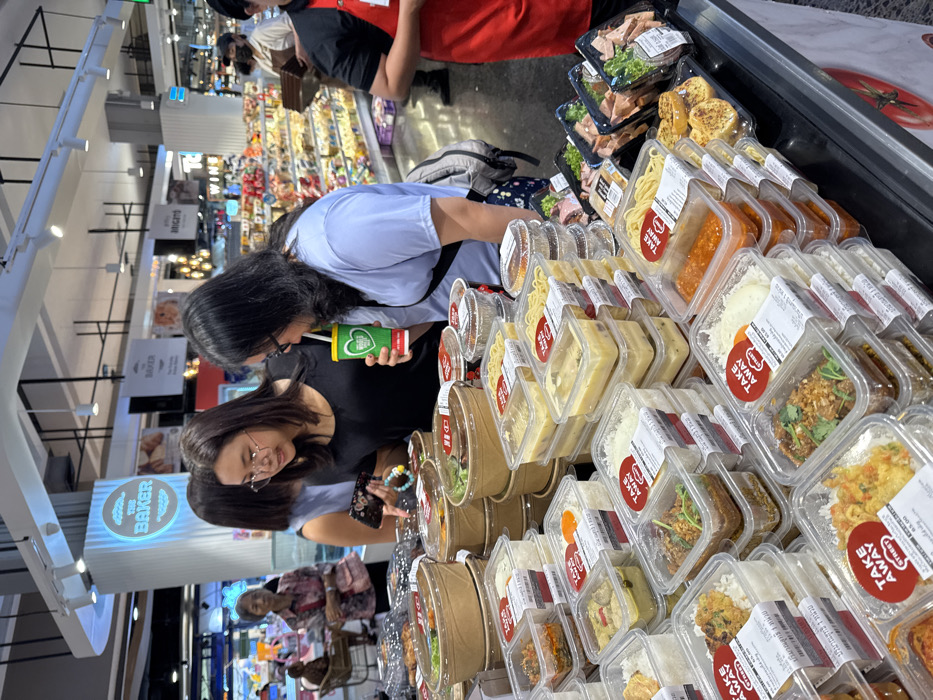 The image depicts an indoor scene within a modern supermarket in Wichit, Thailand, characterized by bright overhead lighting and commercial shelving. In the foreground, a substantial display of pre-packaged "Take Away" food items is presented on a counter. These items consist of clear plastic containers holding various individual meals, such as rice dishes, pasta, and curries, many labeled with red circular "TAKE AWAY" stickers featuring a fork and spoon logo. Additionally, there are brown paper bowls with clear lids, aluminum foil containers, vacuum-sealed packages of sliced meats, and small baked goods like garlic bread. Two East Asian women are central to the image, standing in front of this food display. The woman on the left, wearing a black top and eyeglasses, has dark shoulder-length hair. She is holding a smartphone with a floral case in her left hand and gestures with her right hand towards the food, appearing to examine the selection. The woman on the right, with long dark hair, wears a light blue short-sleeved shirt and patterned trousers. She holds a green cup with a white lid and a straw, from which she is drinking. A light-colored backpack is visible on her back. In the background, other individuals are present. To the far left, an older East Asian woman with light-colored hair and a patterned shirt is visible, standing near a background display. To the right, partially visible, a person in a red apron, possibly a store employee, stands near another food display. Further back, another staff member in a light uniform is seen carrying a wooden crate. Various supermarket aisles with shelves stocked with products and additional illuminated signs, including "THE BAKER" and "WINE," contribute to the commercial setting. The flooring is dark and reflective.