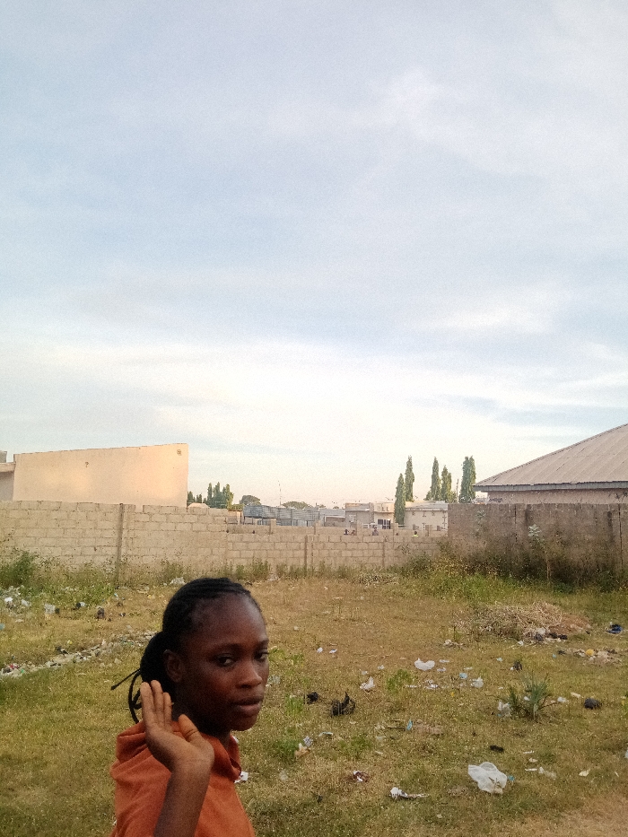 The image captures a young female in Dabawa, Nigeria, positioned in the lower-left foreground of an open, littered field