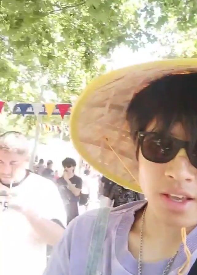 person wearing a woven conical hat, sunglasses, a light purple long-sleeved shirt, and overalls. They are looking at the camera and talking. In the background, there are people walking around, trees, and colorful triangular flags strung overhead. The scene appears to be an outdoor festival or gathering. The camera is held at eye level, giving a first-person perspective.