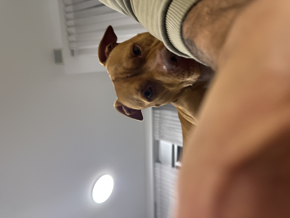 A tan pitbull-type dog stares downward into the camera with dark eyes. A human hand and arm partially obscure the view on the right side of the frame. The dog's head is angled to the left. A light fixture illuminates the gray ceiling in the bottom left corner. Blinds are visible in the background.