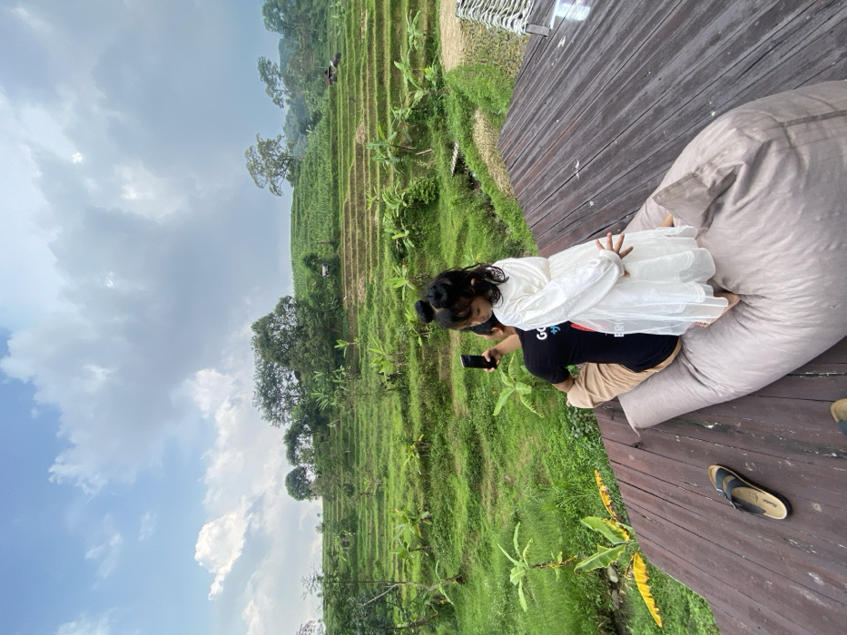 A scene presents a hillside terraced with green foliage under a cloudy sky. On a wooden deck, a girl in a white dress sits on a beige cushion. A person in a black t-shirt and khaki shorts is taking a photo of the girl with a mobile phone. A pair of sandals rests on the wooden surface of the deck.