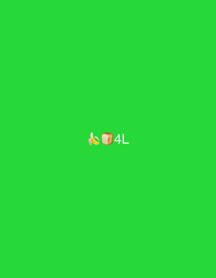 A minimalistic image features a vibrant green background. Near the bottom center of the frame, a banana emoji is positioned alongside a slice of bread emoji. To the right, the text "4L" is displayed in a simple, white font. The elements are small, emphasizing the expanse of the green backdrop.