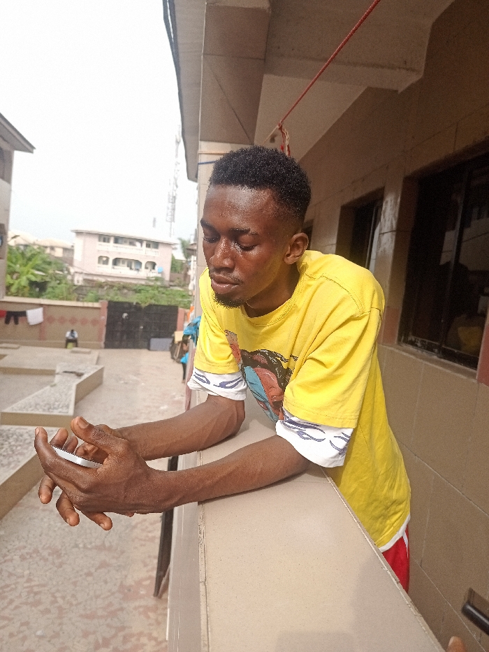 A young Black male, appearing in his late teens or early twenties, stands on an elevated concrete structure in Eziobodo, Nigeria