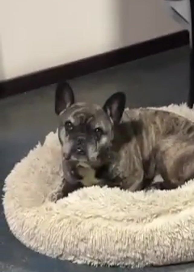 - "brown, brindle French bulldog lying in a round, fluffy, off-white dog bed" by FM-Ucqa63, licensed under CC BY 4.0