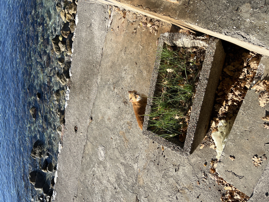 The image displays a coastal scene in Kamenovo, Montenegro. A short-haired, orange tabby cat is positioned centrally, lying on a rough concrete surface and looking directly at the viewer. To the cat's immediate front and slightly right is a rectangular concrete planter containing sparse green grass and dried leaves. The concrete ground surrounding the planter and cat is cracked and shows signs of wear, with scattered brown oak leaves. To the upper left, the concrete area transitions abruptly to a body of clear, blue-green water, presumably the Adriatic Sea, which reveals numerous submerged rocks and pebbles. The shoreline is uneven, composed of larger rocks forming a natural boundary with the concrete. A crumpled white plastic bag is visible on the concrete to the lower left of the planter, amidst more scattered leaves. The scene is illuminated by natural sunlight, casting distinct shadows.