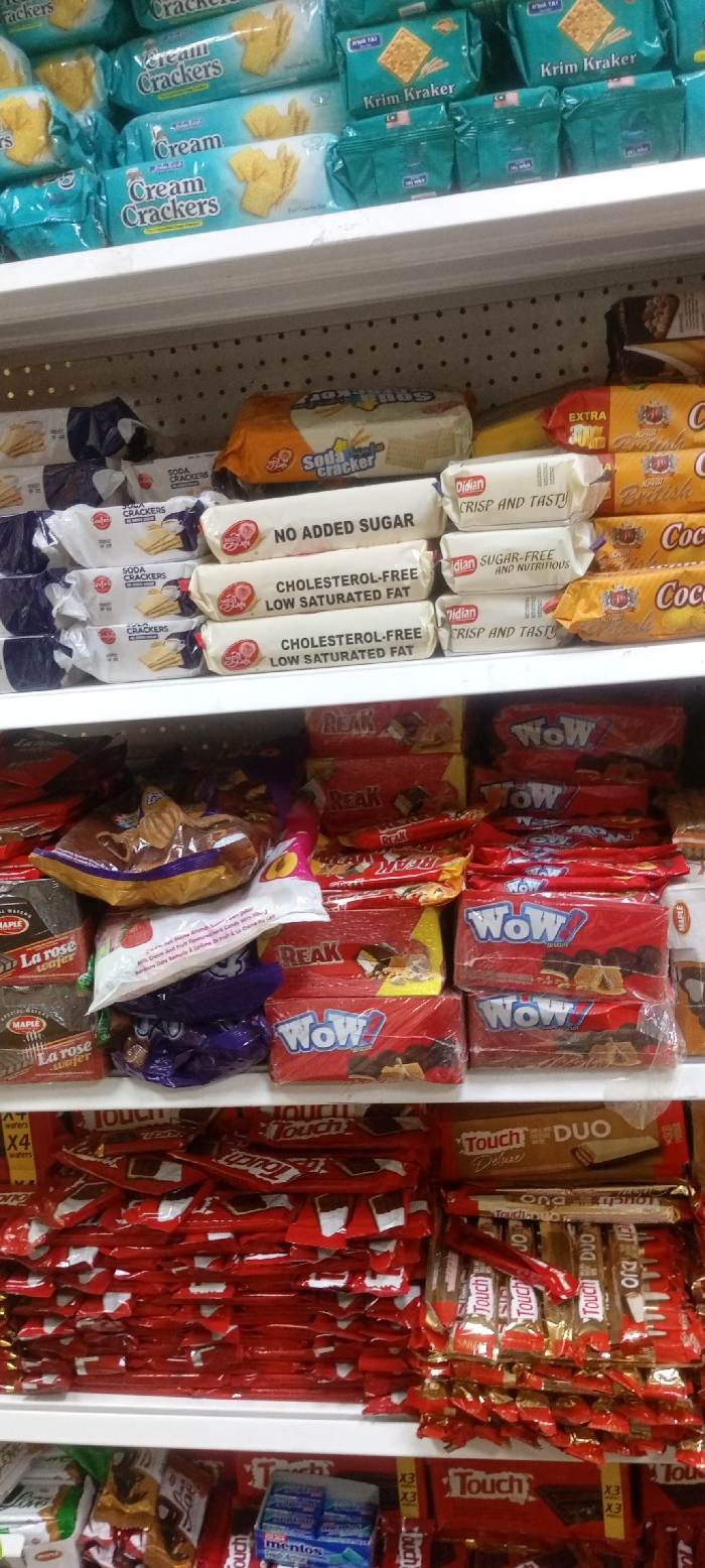 - "The image displays a vertical arrangement of five retail shelves, fully stocked with packaged snack foods, primarily biscuits, crackers, and confectionery bars, inside a store located in Sani Mai Nagge, Nigeria" by FM-oATT32, licensed under CC BY 4.0