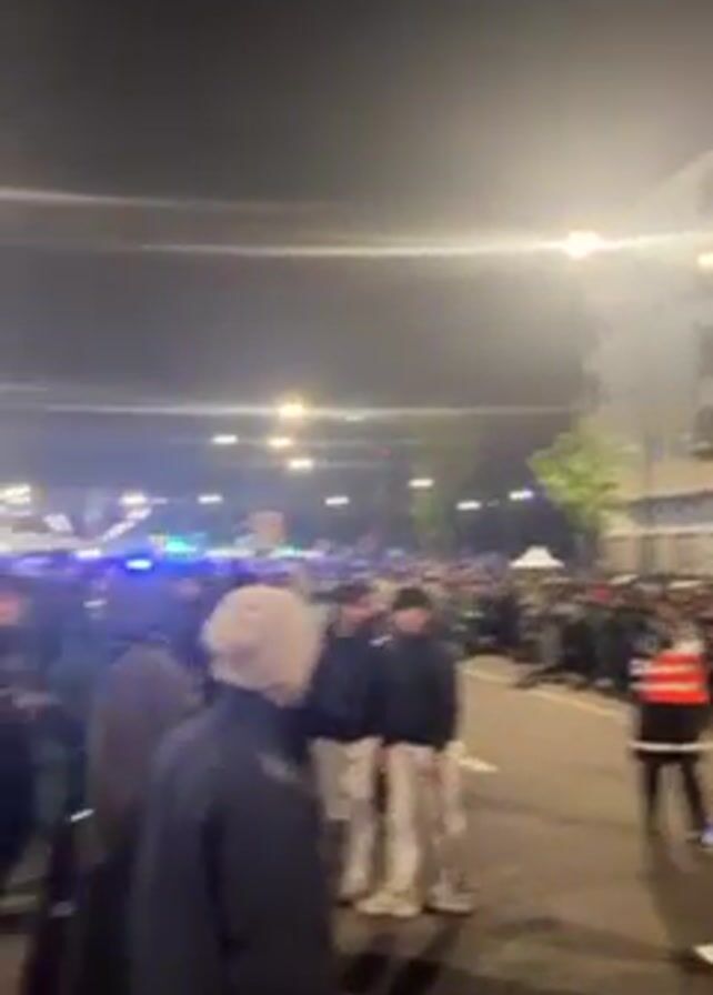 crowded street at night. People are milling about, some walking and others standing. A police officer in a high-visibility vest is positioned in the middle of the street. There are buildings on either side of the street, and streetlights illuminate the scene. Smoke or fog hangs in the air, possibly from fireworks or other celebratory activities. The overall atmosphere appears festive and lively.