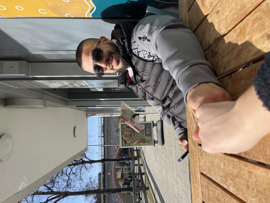 - "A daytime outdoor scene in Garmisch-Partenkirchen, Germany, depicts a male seated at a light brown wooden slatted table, facing the camera with a direct smile" by FM-i0Lrk2, licensed under CC BY 4.0